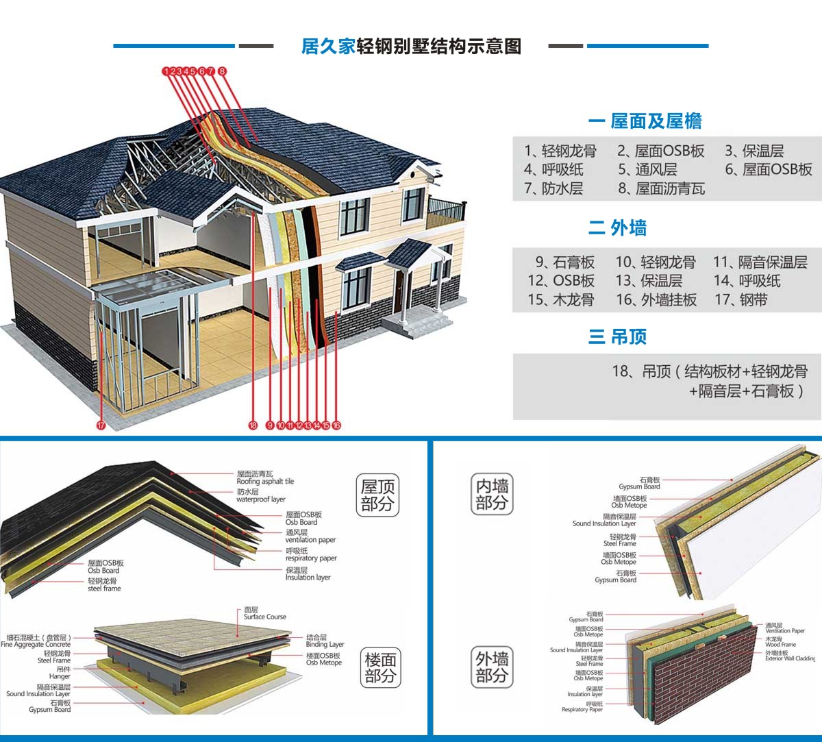 居久家輕鋼別墅隸屬于四川萬建城建筑工程有限公司,集科研、設(shè)計、咨詢、加工、生產(chǎn)安裝為一體。一直致力于新型輕鋼結(jié)構(gòu)房屋的研究、開發(fā)和應(yīng)用,倡導(dǎo)房屋建筑的設(shè)計和應(yīng)用在標(biāo)準(zhǔn)化、模塊化、通用化、規(guī)?;a(chǎn)的同時,實現(xiàn)人居環(huán)境的個性化、人性化、以及健康和舒適。 公司目前引進(jìn)具有國內(nèi)先進(jìn)水平輕鋼結(jié)構(gòu)房屋建筑技術(shù)和生產(chǎn)線,標(biāo)準(zhǔn)化、精細(xì)化和定制化設(shè)計、制造、安裝輕鋼結(jié)構(gòu)房屋。不僅能夠提供風(fēng)格各異的別墅建筑,同樣能夠提供行業(yè)標(biāo)準(zhǔn)的輕鋼樓宇建筑及建筑群。居久家裝配式房屋技術(shù)體系是高效節(jié)能型綠色建筑體系,各項建筑物理性能卓越,處于業(yè)內(nèi)先進(jìn)水平,能夠為客戶提供全程模塊化綠色建筑集成解決方案。